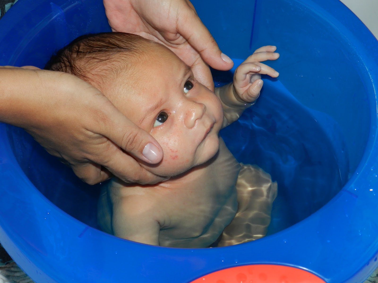 Ao completar seu primeiro mês de vida, Mateus viveria algumas experiências novas. Estava tudo planejado! Experimentaria o sling, seria massageado aos moldes do shantalla e tomaria banho de balde.
